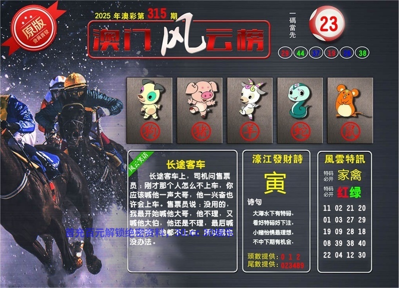 318期:风云榜-濠江發財詩【芥】 诗句:狗来鸡去又一年,顺风顺水顺人意,一码开出定头尾,一二生肖讲你知。解狗猪羊蛇鼠 今日生肖:狗猪羊蛇鼠 |